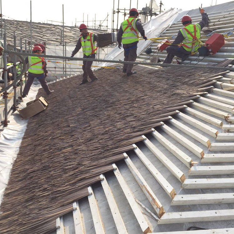 ? ? ? ? 安裝仿真茅草之前,必須要對屋頂做防水系統(tǒng),先做好防水層,再在防水層上鋪木條或水泥板塊,這樣以便于安裝仿真茅草。茅草瓦安裝較厚時具有一定的防水作用,但也要防止長時間下雨會有漏雨的可能,所以也要做好專業(yè)的防水層系統(tǒng)。在屋面做好防水系統(tǒng)后,再在上面放防腐木條,并做防水處理,再鋪蓋仿真茅草瓦。并由屋檐從下向上鋪,與常規(guī)的屋頂鋪瓦的方法一樣,或者在做好屋面防水系統(tǒng)后,可以放水泥板塊,這樣就可以直接在水泥板塊上直接安裝仿真茅草瓦。這樣就可以保證安裝仿真茅草在屋面上不會漏雨了。