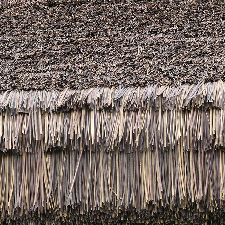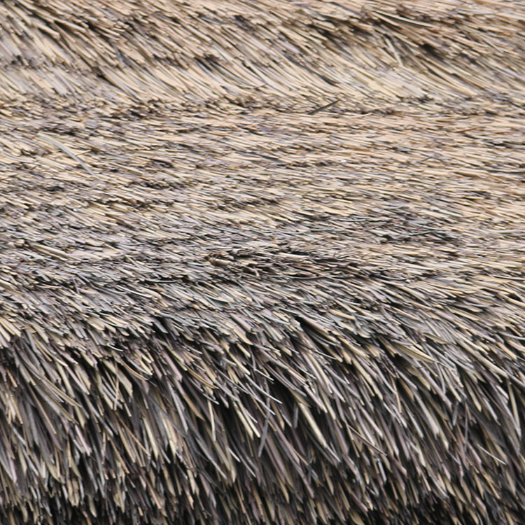 屋脊分斜脊和正脊,先將茅草鋪在斜脊兩側(cè)主面,然后同步從下向上進(jìn)行鋪茅草,直至鋪出脊梁形狀,形成雨水從上向下流的導(dǎo)向,把屋面茅草瓦片鋪完就可以做正脊收口,這里斜脊和正脊茅草要把主屋面茅草壓住,可根據(jù)實(shí)際大小調(diào)整茅草瓦片的長短,可剪成小片茅草,便宜安裝,體現(xiàn)自然效果。鋪完屋脊兩邊再在屋脊正梁上鋪一排茅草,這樣整個茅草屋頂基本安裝完畢,剩下收尾部分,可根據(jù)自己的喜好效果,適當(dāng)修飾調(diào)整。