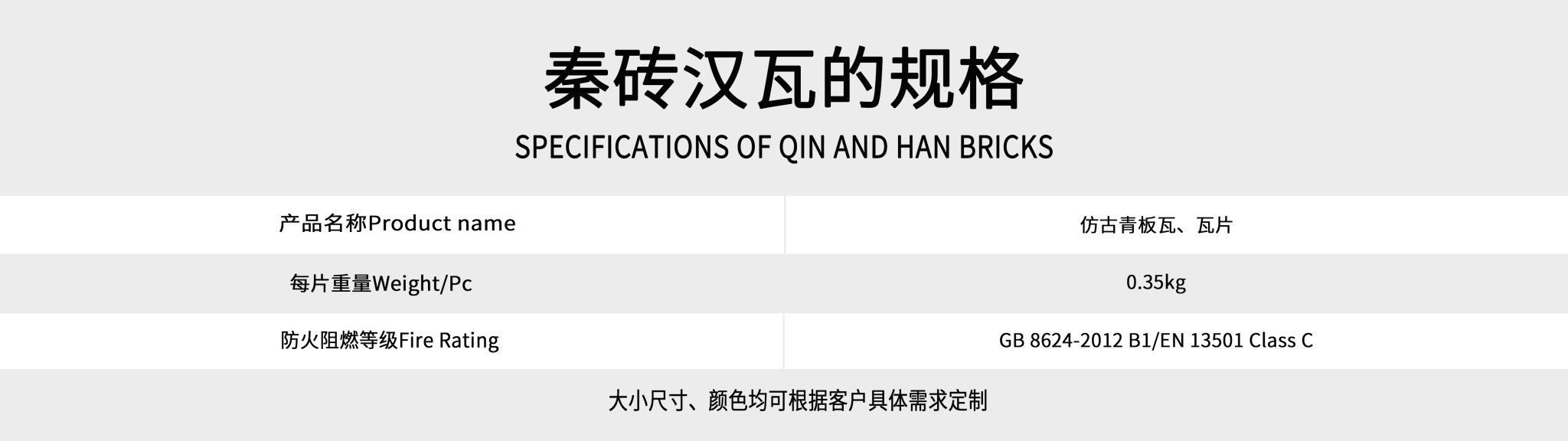 仿古青瓦-板瓦導(dǎo)熱系數(shù)為0.325W/mk,是粘土瓦的1/3,厚水泥瓦的1/5,0.5mm厚彩鋼瓦的1/2000。在不考慮加保溫層的情況下,合成秦磚漢瓦的隔熱保溫性能達(dá)到更佳。