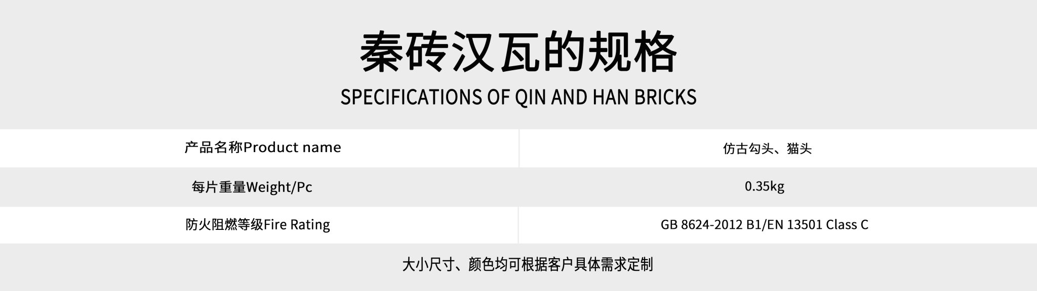 仿古勾頭在自然環(huán)境中具有更佳尋常的耐久性,它即使長期暴露于紫外線、強光、潮濕、寒熱等惡劣環(huán)境下,仍能保持其顏色和物理性能的穩(wěn)定性。經(jīng)試驗檢測證明,可以確保15年△E值小于5。秦磚漢瓦通過了12000小時的人工老化測試,檢測結(jié)果△E=3.86。(根據(jù)太陽照射量和年日照時間,12000小時檢測試驗相當(dāng)于自然使用45年,遇冷不脆、遇熱不軟,長期使用環(huán)境溫度-40℃至200℃,與鋼鐵熱膨脹系數(shù)基本一致,使因溫差產(chǎn)生的位移基本相等。