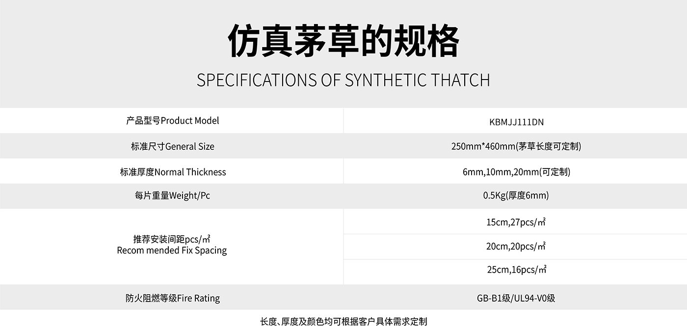 ? ? ? ? 仿真茅草深圳市科佰工貿(mào)有限公司采用目前國際上先進的納米合成高分子材料技術和工藝生產(chǎn)。利用納米粒子的特有的物理化學性質(zhì),使得其具有更加優(yōu)異的耐候性及阻燃性,能滿足美國ASTM-G154-06 抗UV老化測試標準,并能通過美標UL94-V0級阻燃,在國內(nèi)仿真茅草也通過了國家防火建材阻燃測試B1級。?