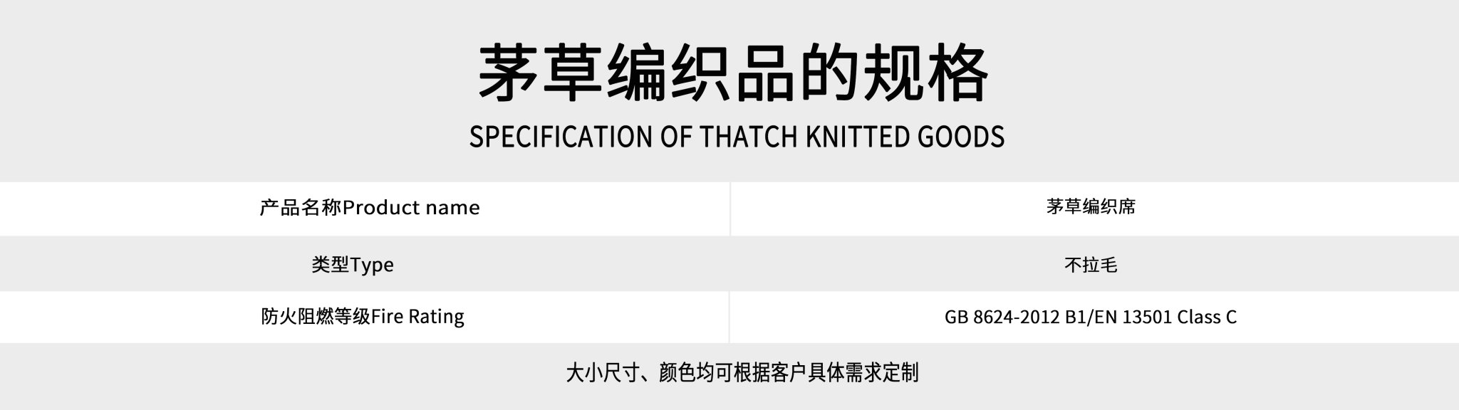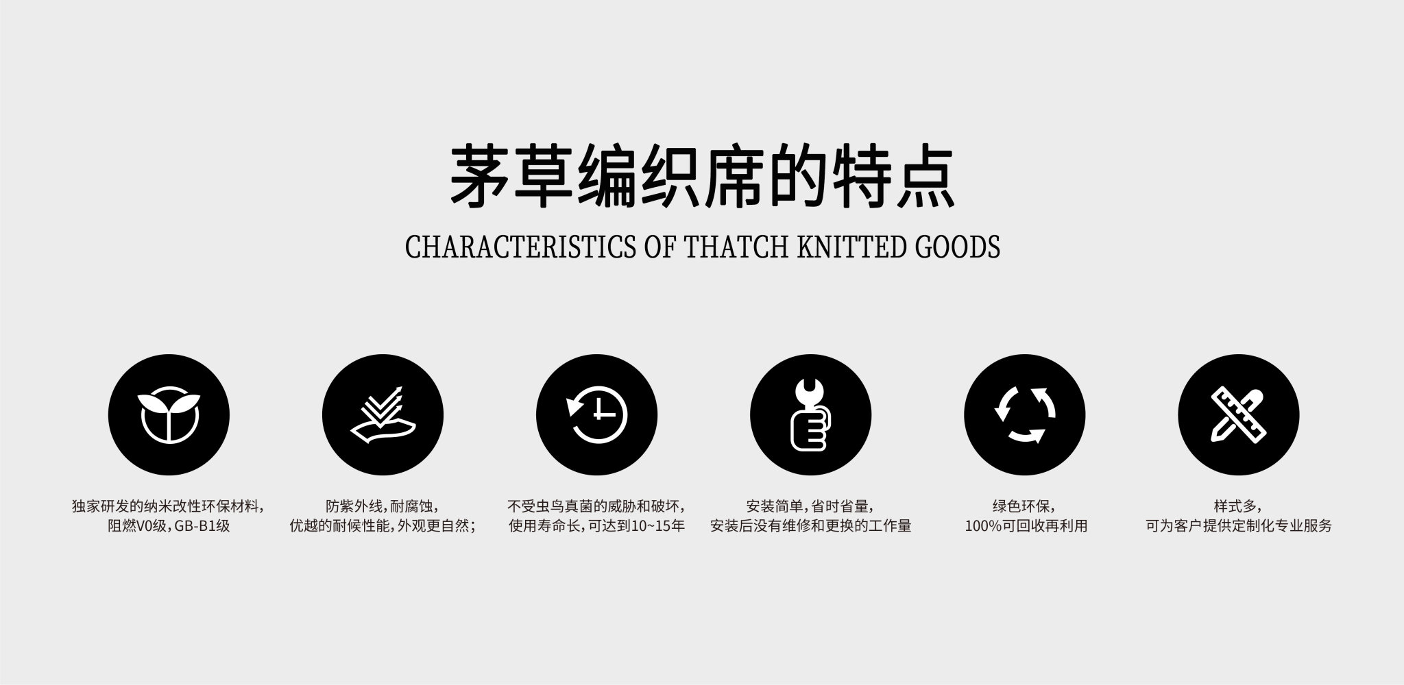 ? ? ? ? 茅草編織席是深圳市科佰工貿(mào)有限公司采用目前國際上先進的納米合成高分子材料技術和工藝生產(chǎn)。利用納米粒子的特有的物理化學性質(zhì),使得其具有更加優(yōu)異的耐候性及阻燃性,能滿足美國ASTM-G154-06 抗UV老化測試標準,并能通過美標UL94-V0級阻燃,在國內(nèi)茅草編織席也通過了國家防火建材阻燃測試B1級。?